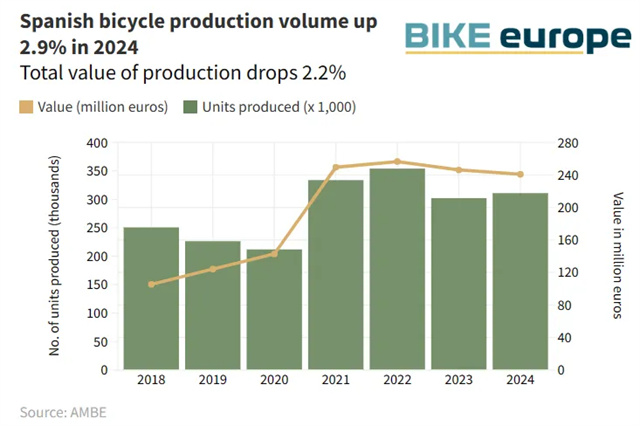 據(jù)工業(yè)與旅游部新數(shù)據(jù),2024年西班牙自行車(chē)總產(chǎn)量達(dá)30.99萬(wàn)輛,同比上升2.9%,總產(chǎn)值達(dá)2.401億歐元。盡管單車(chē)均價(jià)從2023年的775歐元降至725歐元,導(dǎo)致行業(yè)總營(yíng)收微降2.2%,但對(duì)比疫情前的2019年,產(chǎn)值仍近乎翻倍,展現(xiàn)出強(qiáng)勁韌性。
